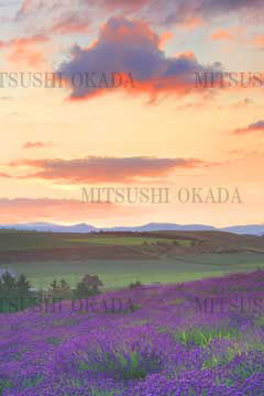 FUKEI-23959 ラベンダー畑の丘と流れ動く夕焼けの雲 上富良野町 空知郡 北海道 かんのファームで撮影 2010年7月撮影 |