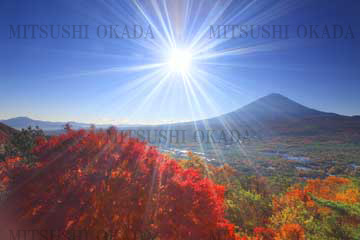 FUKEI-26283 モミジの紅葉と富士山と太陽の光芒 鳴沢村 南都留郡 山梨県 紅葉台で撮影 2010年11月撮影 |