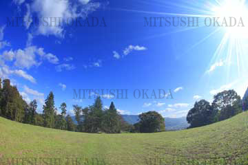 FUKEI-49929 二の郭跡の広場と太陽の光芒 魚眼 群馬県 利根郡 みなかみ町 名胡桃城址で撮影 2014 10 10