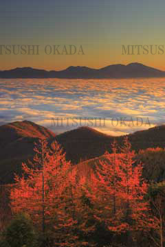 FUKEI-50147 朝日に染まる白馬連峰と紅葉の樹林と雲海 長野県 上田市 道の駅美ヶ原高原美術館付近で撮影 2014 10 25